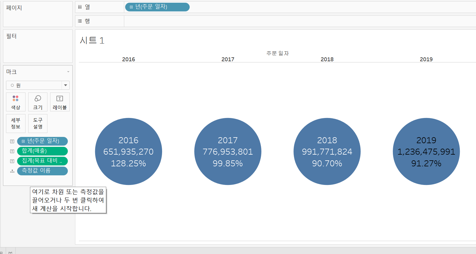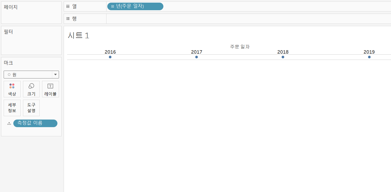 가장 먼저 측정값의 연도를 차원으로 드래그 앤드 드롭해줍니다.