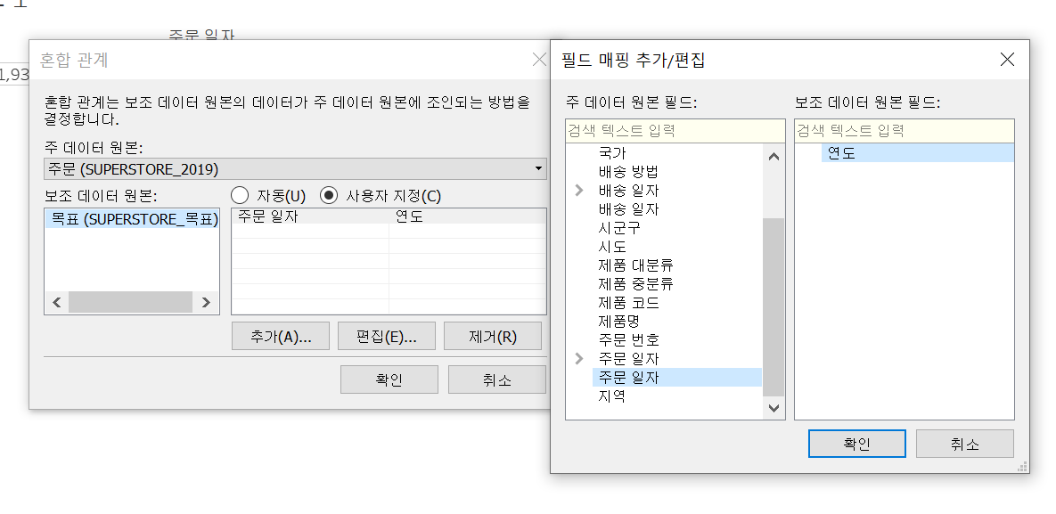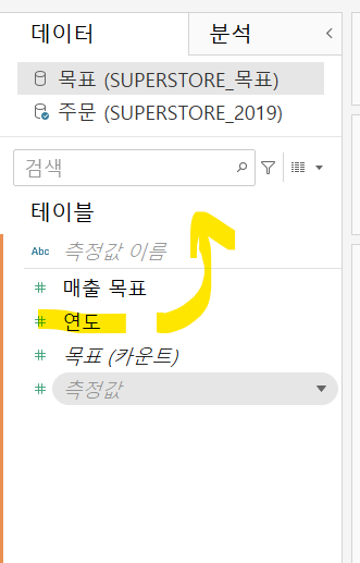 이제 주문과 목표라는 두 시트를 연결해보겠습니다. 두 시트는 차원에서 동일한 필드 유형으로 동일한 필드명이 존재하지 않기 때문에 수동으로 연결을 해줘야 합니다 .