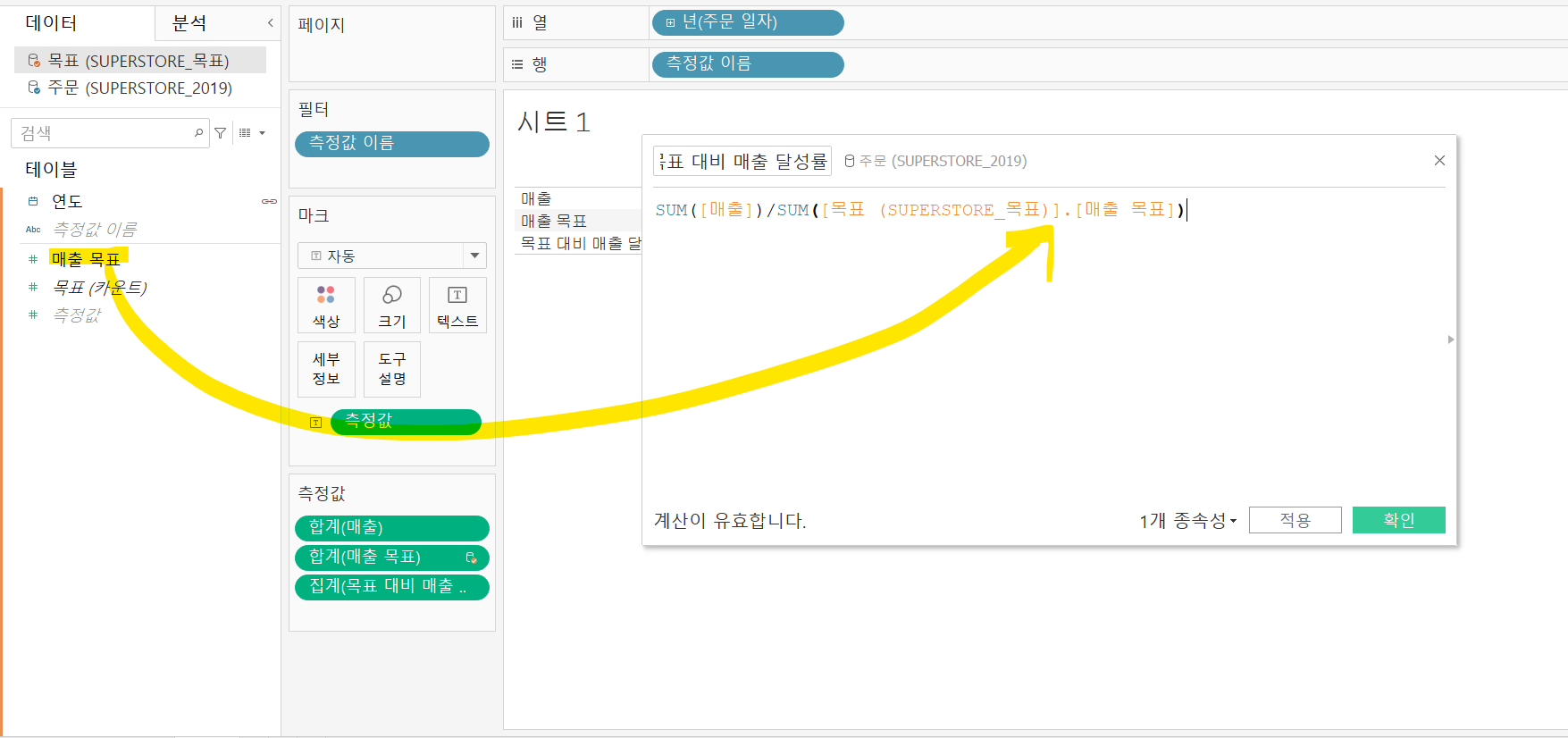그리고 아직 확인을 누르지 말고 다시 데이터 원본을 목표로 바꾸고 매출 목표를 잡고 계산된 필드 만들기 창안으로 넣습니다.