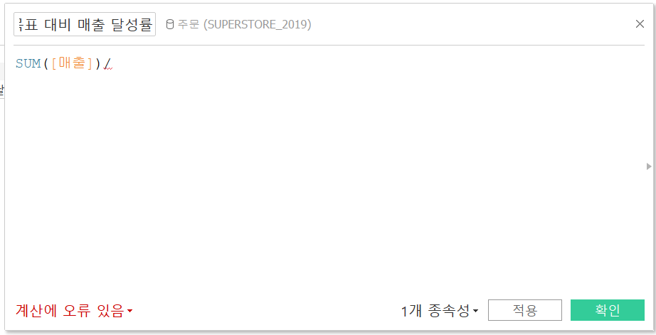 다시 주 데이터로 넘어가겠습니다. 주문 데이터를 선택하고 계산된 필드 만들기를 선택하고 아래와 같은 수식을 입력해줍니다. (목표 대비 매출 달성률)