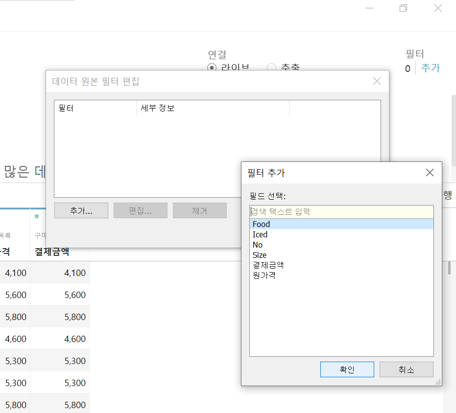 화면 우상단에 필터- 추가를 누르고 데이터 원본 편집 창에서 추가를 선택 -> 필터 추가 탭에서 Food를 선택합니다.