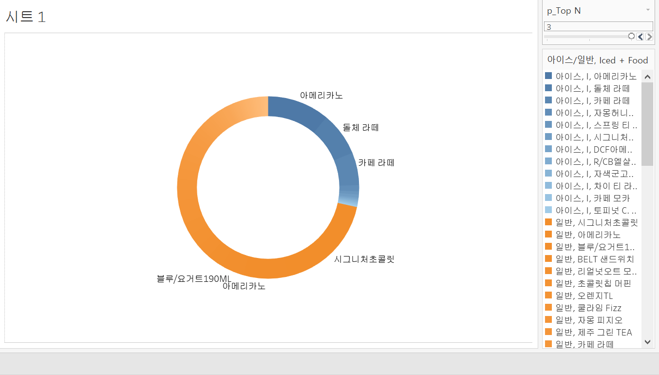 이제 매개 변수의 값에 따라 도넛 차트 내 아이스 Food와 도넛 Food 각각 상위 N개를 보여 주도록 계산식을 만들겠습니다.