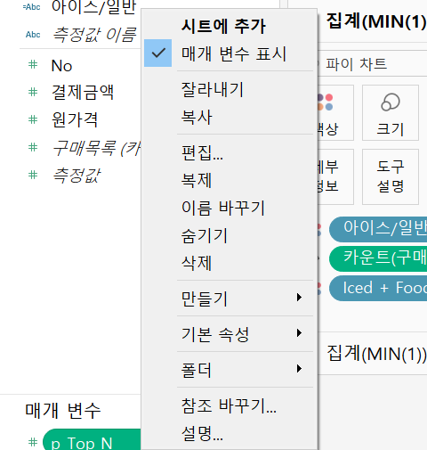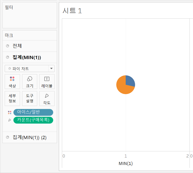 그리고 생성된 '아이스/일반'필드를 '집계(MIN(1))' 색상마크에 올려줍니다.