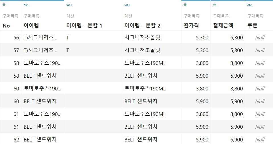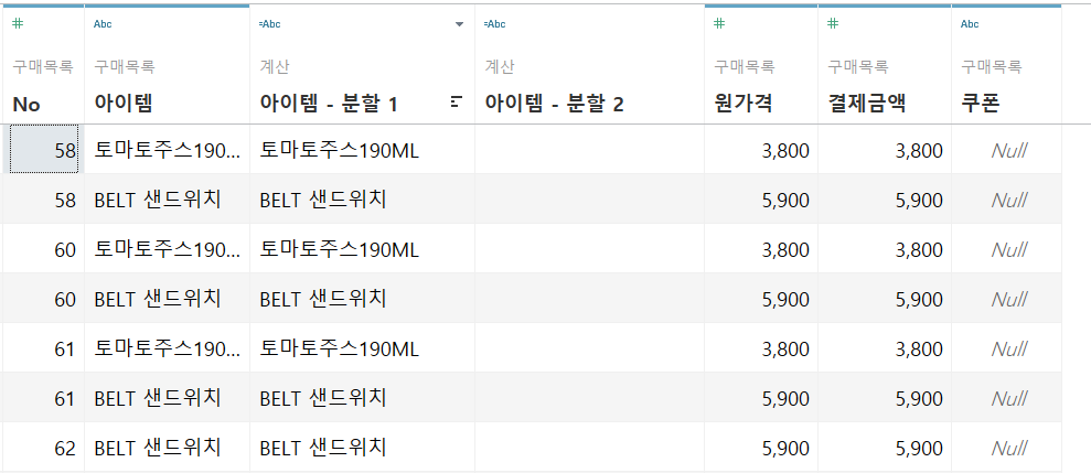 그런데 '토마토주스 190ML'와 'BELT 샌드위치'는 분할1 보다는 분할2로 처리하는게 맞아 보입니다.