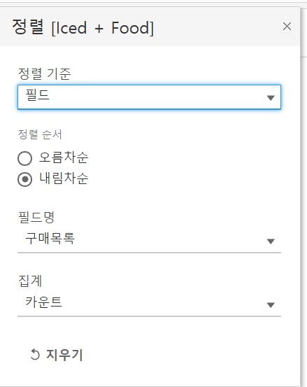 색상 마크 역할을 하고 있는 'Iced + Food'를 우클릭 - 정렬을 선택하고 아래와 같이 설정하여 구매건수에 따라 내림차순 정렬이 되도록 설정합니다.
