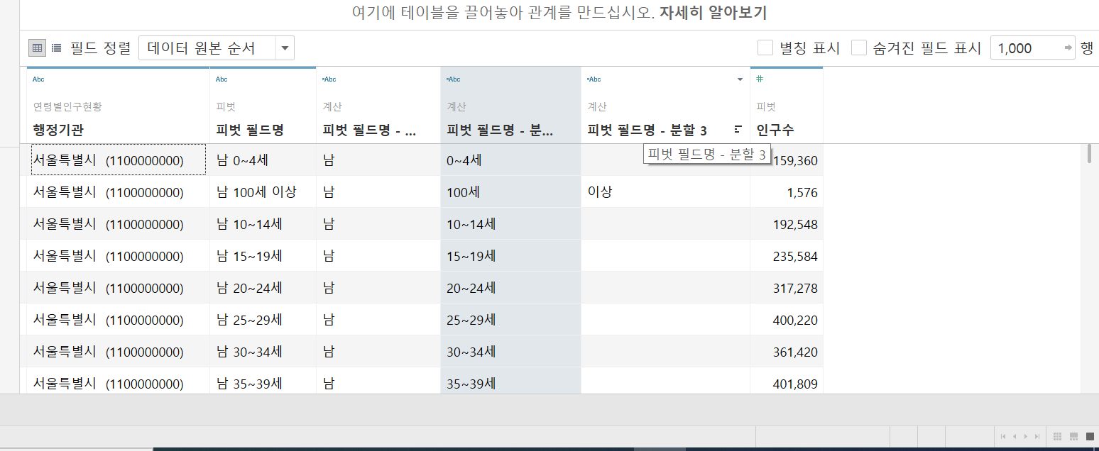 여기서 생성된 필드들의 이름을 아래와 같이 변경합니다.(시도, 시군구, 일반구)