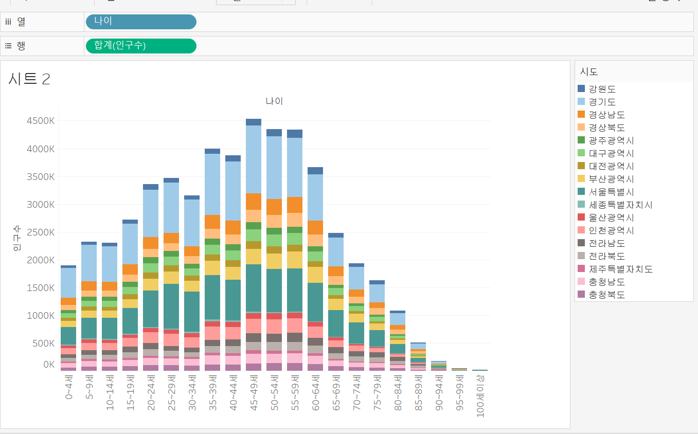 완성된 데이터로 간단하게 각 시도의 연령별 인구를 시각화 해보면 아래와 같습니다.