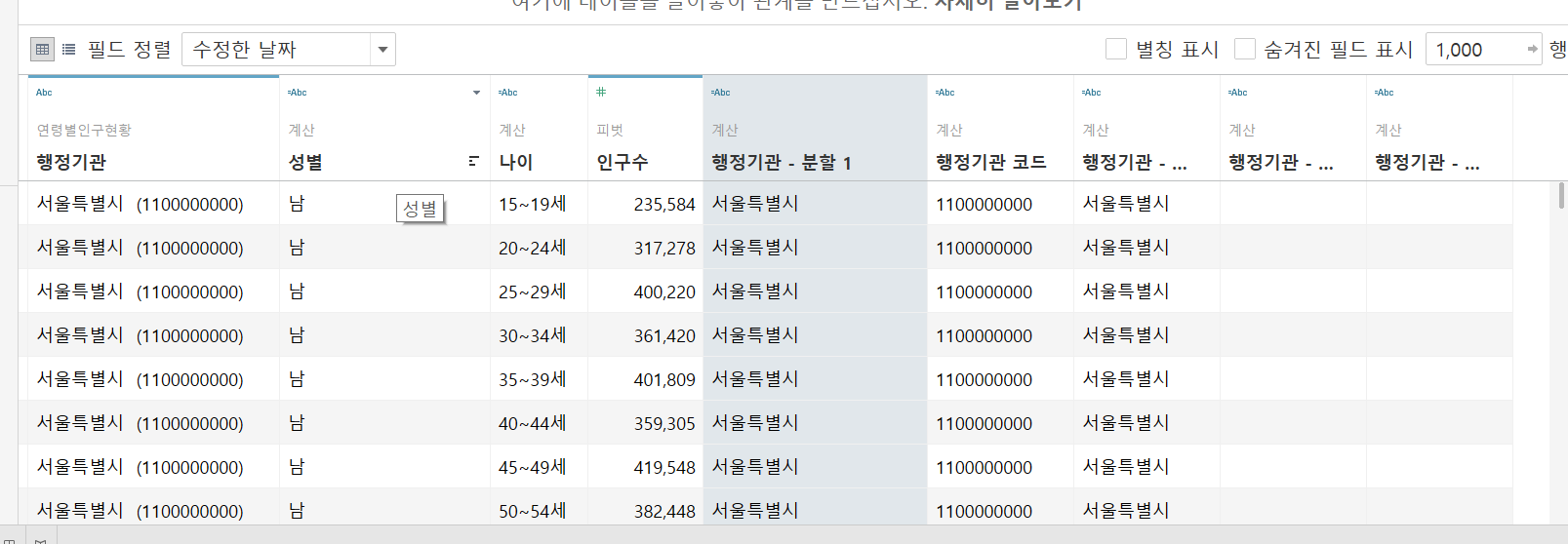 맨 위에 있는 '서울특별시'같은 경우 시군구 값은 없는 25개의 구의 동일 나이의 인구수 총합입니다.