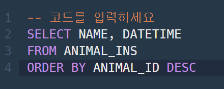 문제: 동물 보호소에 들어온 모든 동물의 이름과 보호 시작일을 조회하는 SQL문을 작성해주세요. 이때 결과는 ANIMAL_ID 역순으로 보여주세요. SQL을 실행하면 다음과 같이 출력되어야 합니다.