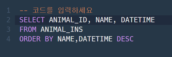 문제: 동물 보호소에 들어온 모든 동물의 아이디와 이름, 보호 시작일을 이름 순으로 조회하는 SQL문을 작성해주세요. 단, 이름이 같은 동물 중에서는 보호를 나중에 시작한 동물을 먼저 보여줘야 합니다.