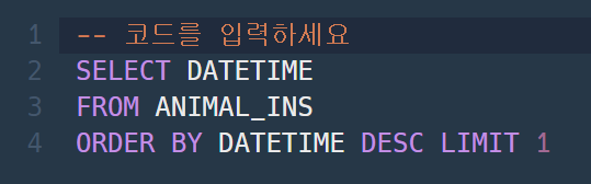 문제: 가장 최근에 들어온 동물은 언제 들어왔는지 조회하는 SQL 문을 작성해주세요.