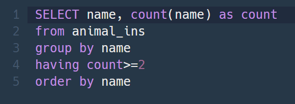 문제: 동물 보호소에 들어온 동물 이름 중 두 번 이상 쓰인 이름과 해당 이름이 쓰인 횟수를 조회하는 SQL문을 작성해주세요. 이때 결과는 이름이 없는 동물은 집계에서 제외하며, 결과는 이름 순으로 조회해주세요.