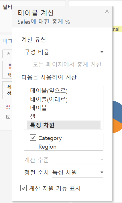 그 후 sales 우클릭 - 퀵 테이블 계산 -> 구성비율을 선택하여 구성비율로 차트를 표시한다.