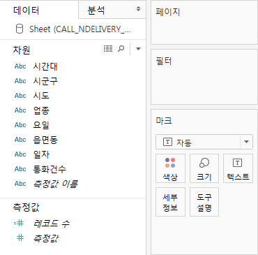 태블로에 해당 엑셀파일을 올린 후 시트로 넘어가서 왼쪽 데이터 탭을 보면 통화건수가 측정값이 아닌 차원에 올라가 있는 모습을 볼 수 있습니다.