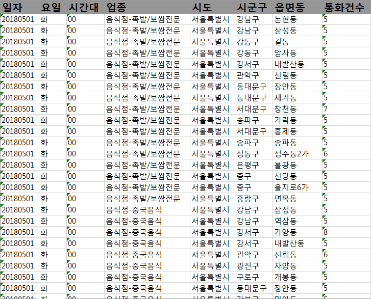 그런데 우리는 이러한 통화건수를 일자별로, 요일별로, 시간대별로, 업종별로, 행정구역별로도 볼 수 있습니다.