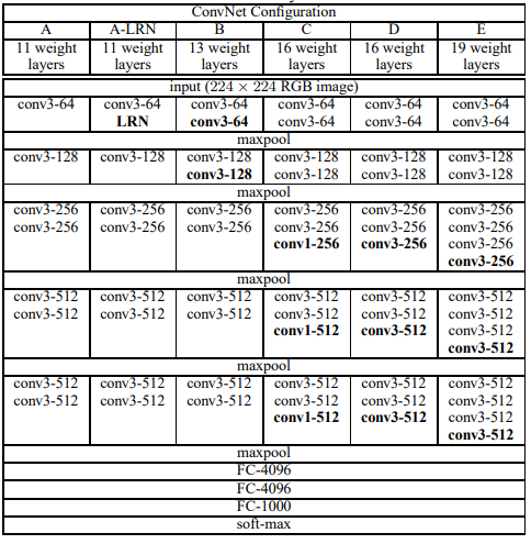 본 논문에서 평가된 ConvNet 구성은 열당 하나씩 Table 1에 요약되어 있습니다. 모든 구성은 arcitecture에 제시된 일반적인 설계를 따르며, 깊이에서만 다릅니다. 즉, 네트워크 A의 11개의 가중치 계층(8개의 컨볼루션과 3개의 FC 계층)에서 네트워크 E의 19개의 가중치 계층(16개의 컨볼루션과 3개의 FC 계층)까지로 구성됩니다. 더불어 채널의 수는 64로 시작하여 각각의 max-pooling층을 지날때마다 2배씩 증가하여 512까지 증가하게 됩니다.