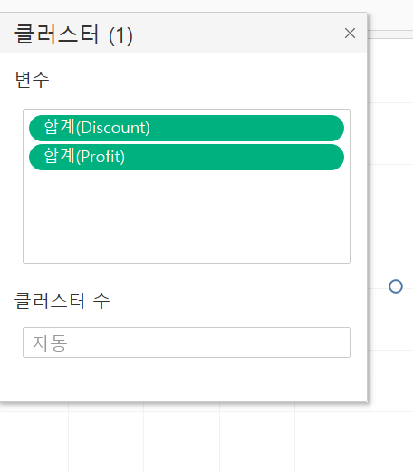 다음과 같이 클러스터를 시트에 끌어와서 클러스터를 표현할 수 있으며 클러스터를 우클릭하여 클러스터 편집을 누리면 다음과 같은 화면이 나온다 이는 클러스터를 구성할때 두개의 변수만을 고려하여 구성했다는 의미를 나타내고 클러스터 수 또한 조정이 가능하다. (kmeans 사용)