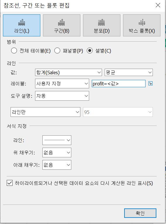 여기서 테이블, 패널, 셀중 어떤 평균에 대하여 라인을 그을 건지 선택할 수 있다.
