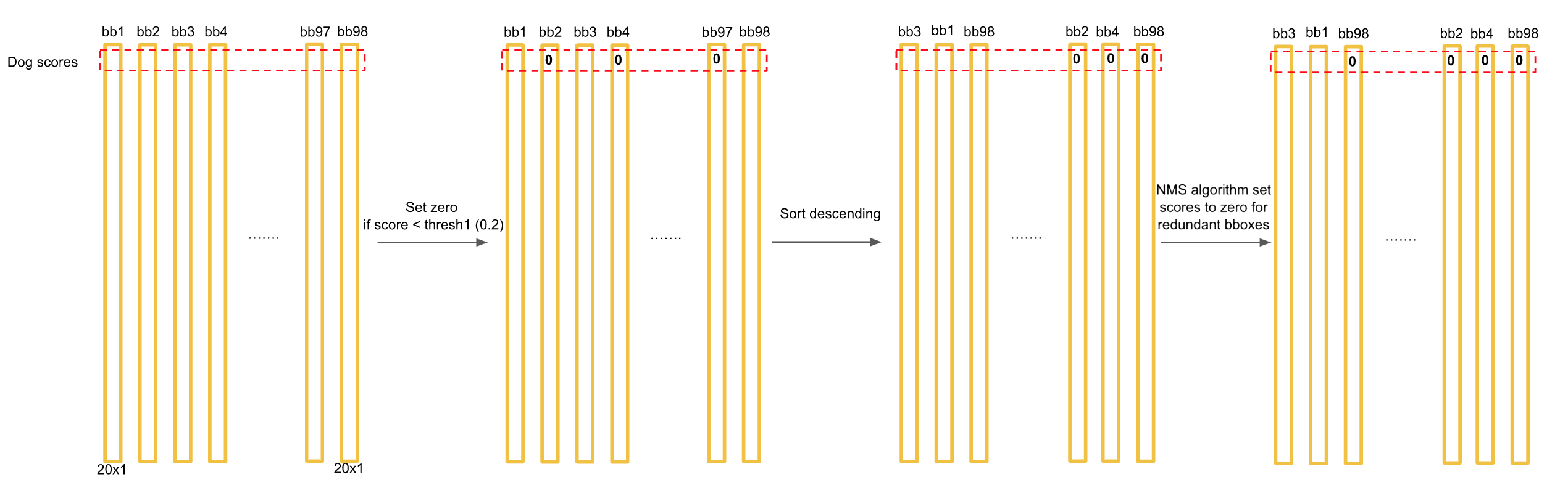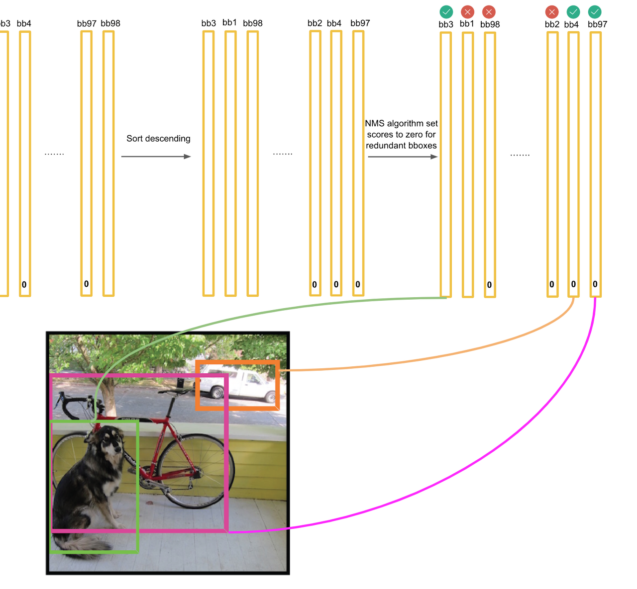 NMS를 거치게 되면 벡터들의 대부분의 값들은 0이 된다. 하나의 바운딩 박스는 하나의 클래스에 속하므로, 벡터에서 최대 값을 계산하여 해당하는 클래스를 이미지 위에 박스와 함께 그려주면 된다.