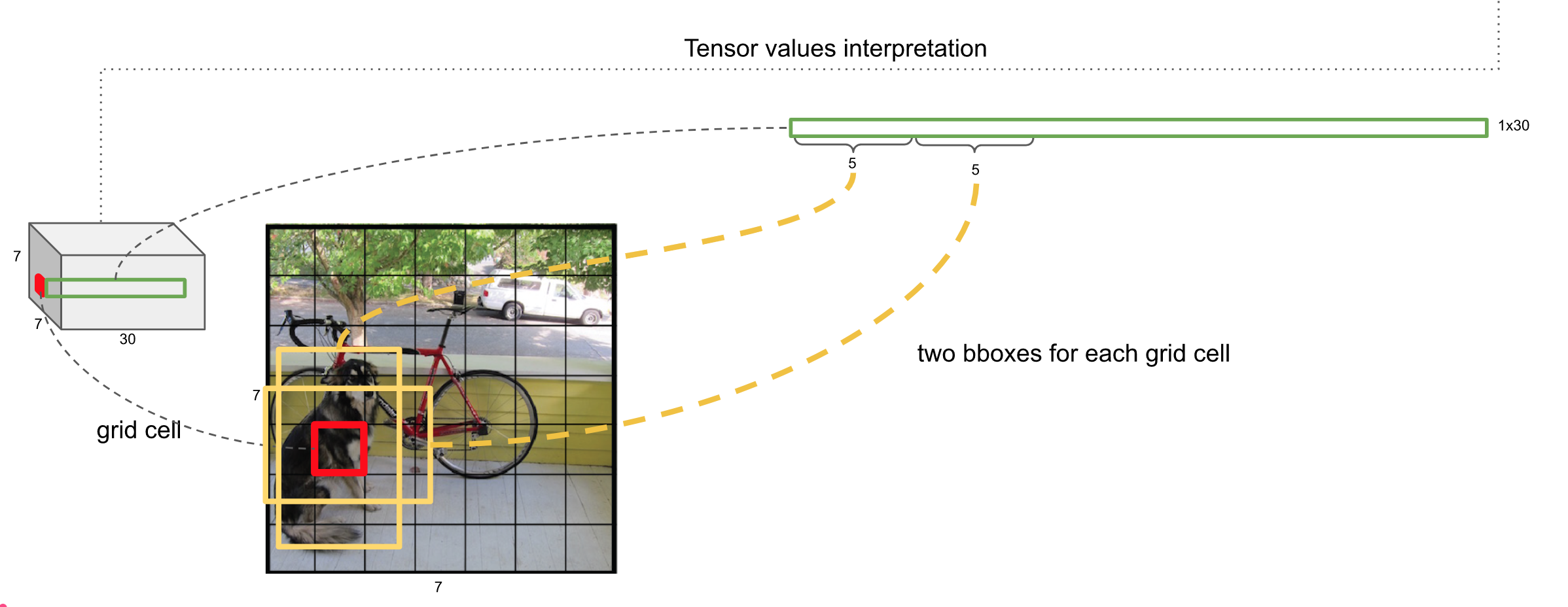 이제 네트워크의 출력인 7x7x30 피쳐맵에 대해서 알아보겠다. 여기 안에는 우리가 앞서서 말했던 그리드 별 바운딩 박스와 신뢰도 지수, 그리고 각 클래스 별 예측값들이 담겨져 있다.