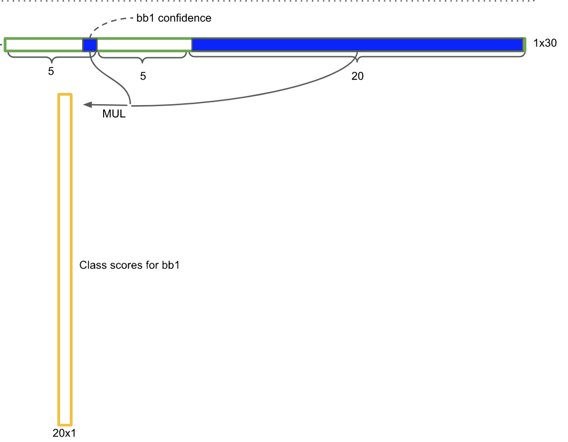 그 다음 오는 20차원 벡터는 해당 인덱스가 특정 클래스일 확률 값들이며, 여기서는 클래스가 20인 데이터 셋을 사용하였기 때문에 20 차원 벡터로 표현된다. 잠깐 기억을 더듬으면 우리는 박스의 신뢰도를 Pr(obj) * IoU로 구했고, 각 클래스별 확률 값을 구할 때는 Pr(classi | object) 로 구했다. 따라서 이 둘을 곱해주면 Pr(classi) * IoU 가 되고, 이는 곧 해당 박스가 특정 클래스일 확률 값이 된다. 이제 이 작업을 인덱스 i의 모든 B개 바운딩 박스에 적용하고, 이를 다시 SxS 인덱스에 적용하면 다음과 같은 결과를 얻는다.