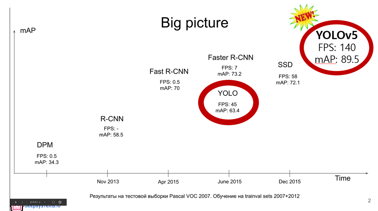 속도는 매우 빠른 반면 정확도는 Faster R-CNN 보다 약간 낮다. 하지만 아주 최근에 나온 YOLOv5는 속도와 정확도면에서 아주 높은 성능을 발휘하고 있다.