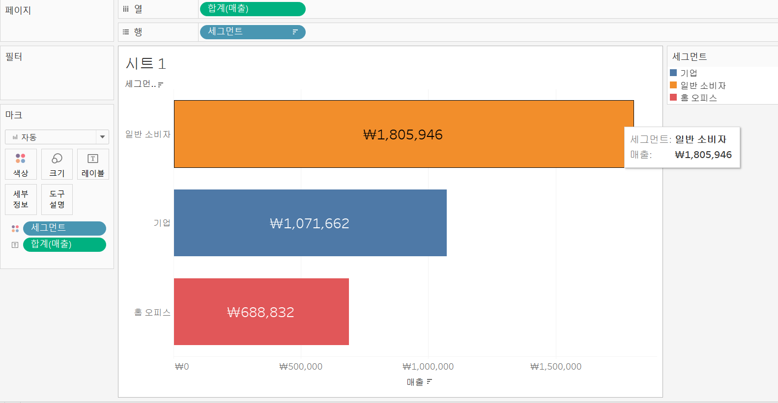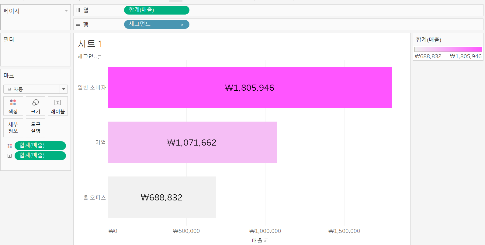 만약 매출을 기준으로 색상을 변경하고 싶다면 매출을 드래그 하여 색상에 드롭하면