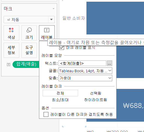 더불어 레이블에 대한 단위를 변경하는 방법은 레이블 마크에 있는 합계(매출)필드에 마우스 오버하면 세모옵션을 클릭할 수 있습니다. 클릭 후 서식을 선택하면 좌측 사이드바가 생성되고