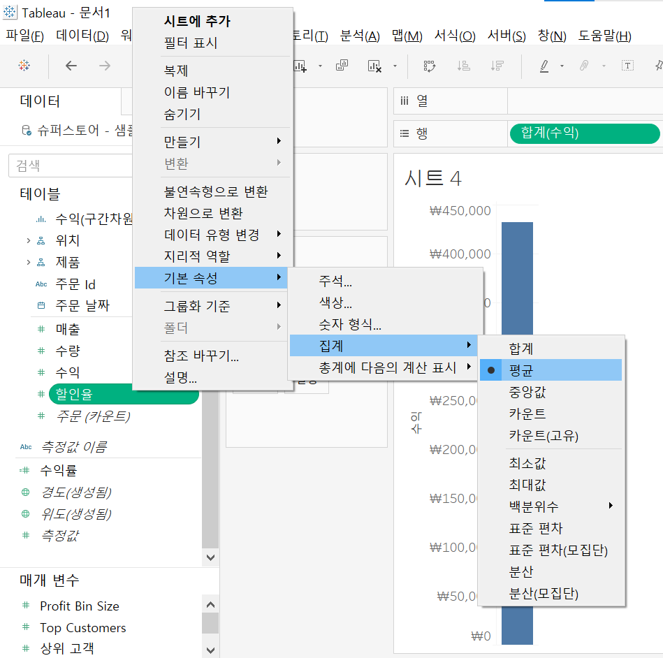 사진과 같이 할인율 필드 -> 기본속성-> 집계 -> 평균을 선택해줍니다 .