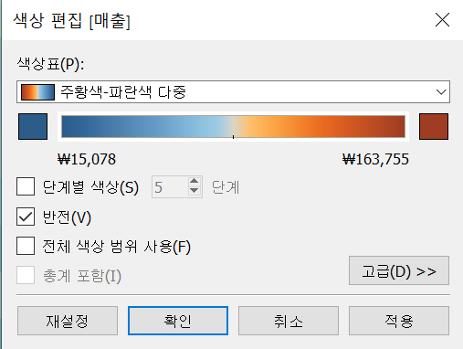 그리고 좀 더 색상 구분을 명확히 표현하기 위해 색상 범례를 더블클릭하여 색상표에서 '주황색-파랑색'을 선택하고 적용 버튼을 누릅니다. 그리고 반전을 체크합니다.