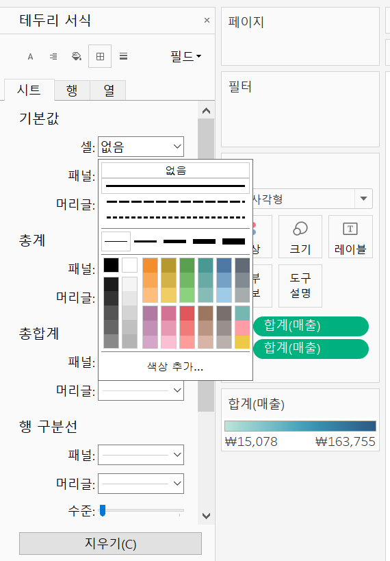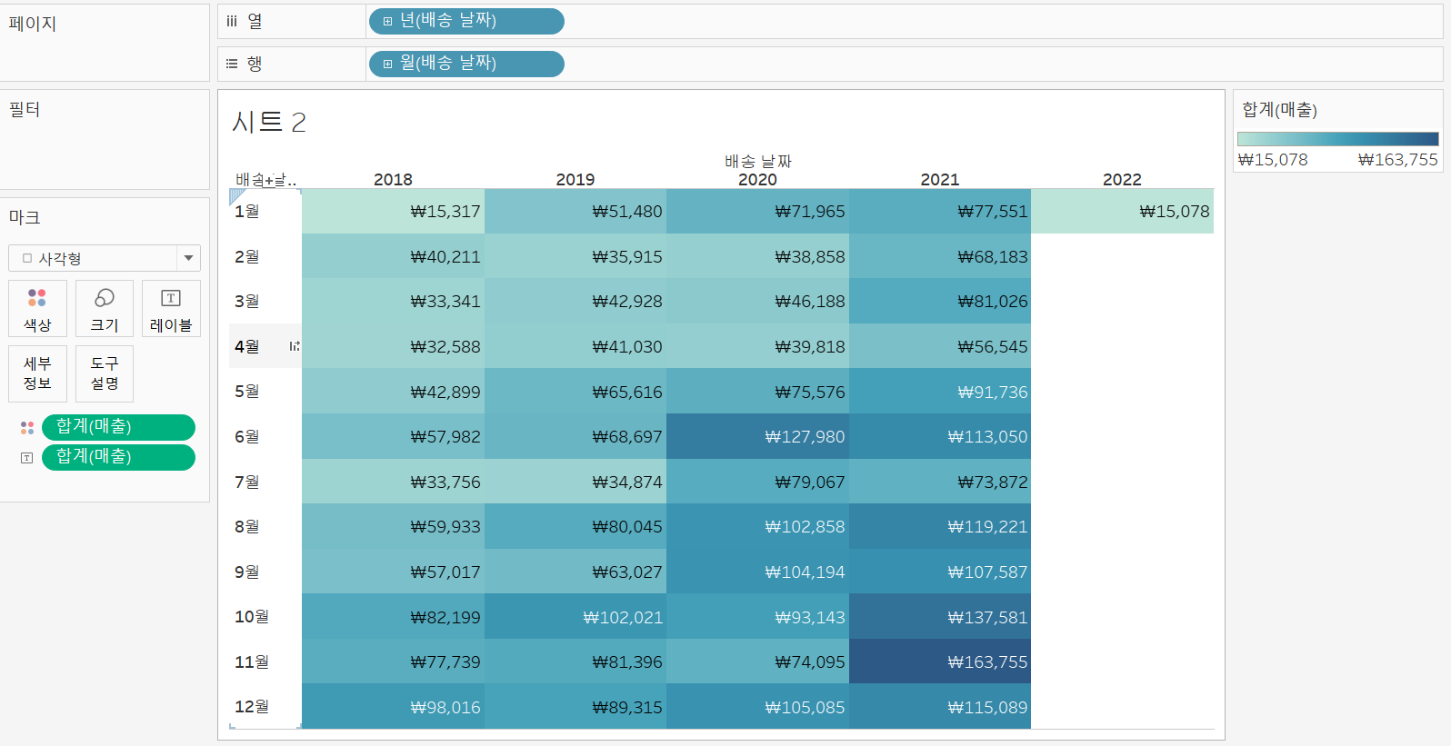 매출을 끌어다 색상과 레이블 마크에 올려주면..!