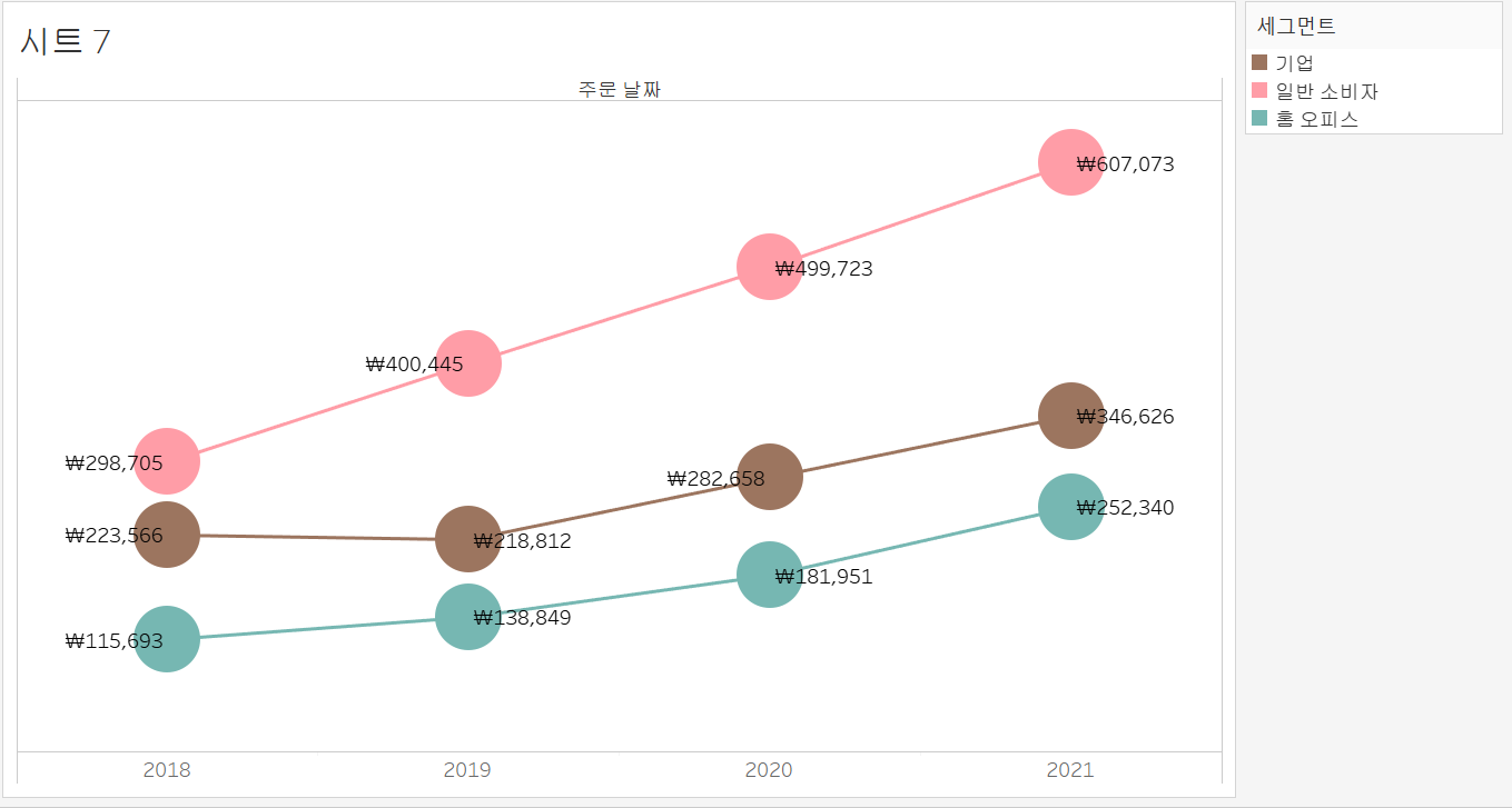 매출합계에 대하여 고객 세그먼트 별로 나타낼 수 있습니다.