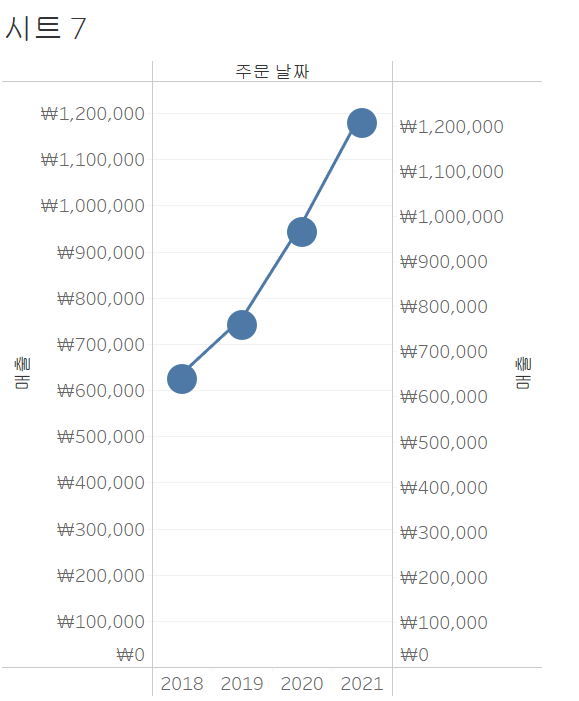 매출과 주문 날짜를 더블클릭하여 선반에 올려줍니다. 그 후 행 선반에 있는 '합계(매출)'을 ctrl키를 누른 상태에서 오른쪽으로 드래그하여 복제를 시킵니다. 복제 후 마크에 있는 '합계(매출)2'를 선택 후 라인 ->원으로 바꿔 줍니다.