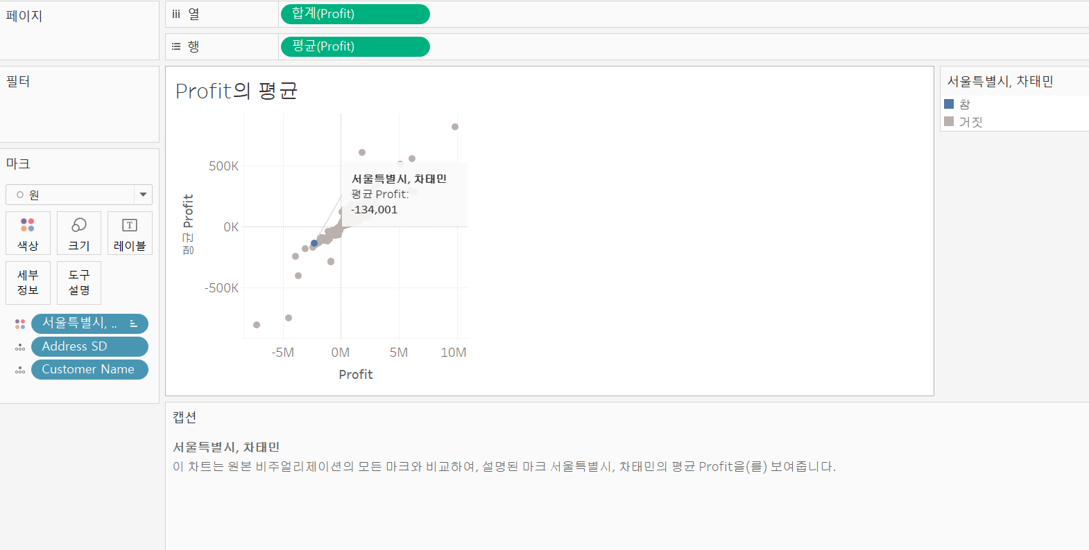 그리고 측정값에 있는 수익 필드를 드래그 해서 색상 마크에 올립니다. 그러면 수익의 합계가 각 고객들을 표시하는 원 마크에 0을 기준으로 색상이 입혀집니다.