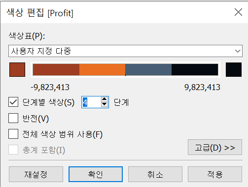 다음과 같이 가장 큰 쪽 색을 검정으로 변경하고 단계별 색상을 4단계로 바꾸어 확은을 눌러줍니다.