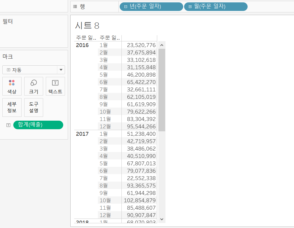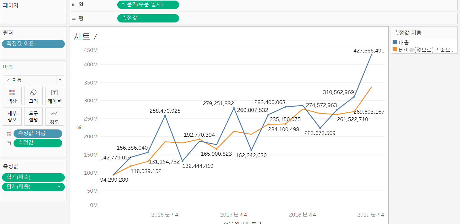 그리고 측정값에 있는 매출을 더블 클릭하여 줍니다.