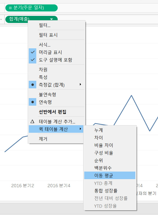 먼저 매출을 더블 클릭하고 주문 일자 필드를 마우스 왼오로 잡고 열 선반에 올린 다음 초록색 연속형 분기(주문 일자)를 선택하여 줍니다. 그리고 행선반에 있는 합계(매출)을 우클릭 -> 퀵 테이블 계산 ->이동 평균을 선택합니다.