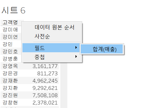 먼저 고객명과 매출을 더블 클릭하여 줍니다. 그리고
