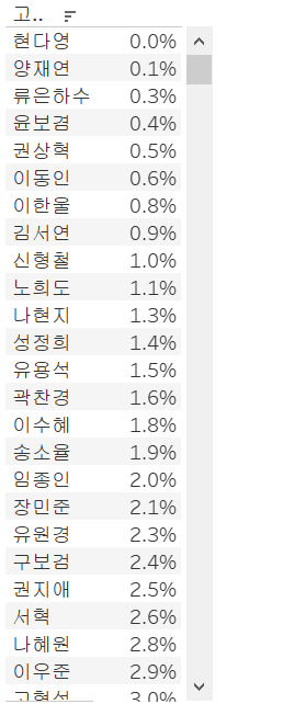 그러면 사진과 같이 결과가 나오게 되고 이는 매출을 가장 많이 기록한 고객은 100%이고 매출이 가장 적은 고객은 0%로 표시가 됩니다.