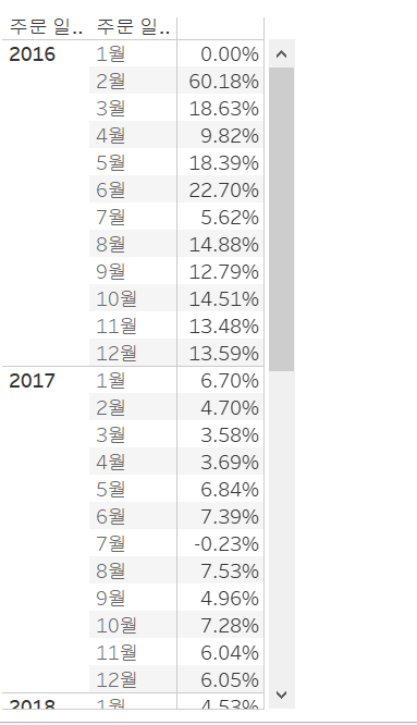 '주문 일자' 필드를 드래그해서 행 선반에 올려 놓은 후 월이 나올때 까지 +버튼을 눌러주고 분기는 선반 밖으로 던져서 제거합니다. 그리고 매출을 더블 클릭하여 주고 마크에서 텍스트로 되어 있는 합계(매출)우클릭-> 퀵 테이블 계산-> 통합성장률을 선택하여 줍니다.