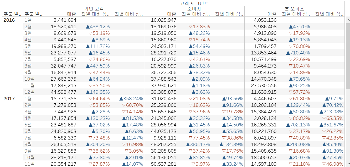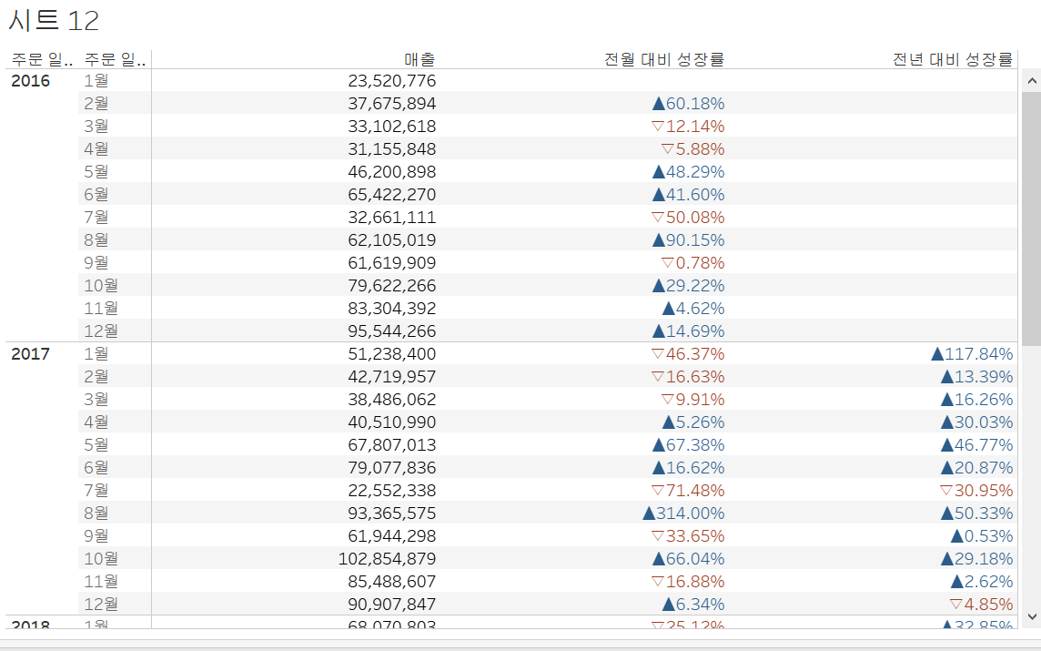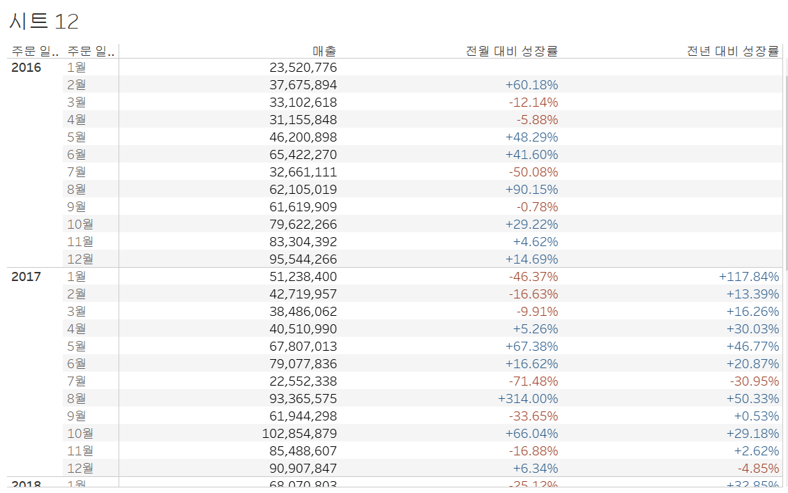 여기서는 매출은 크든 작든 검정색, 전월 대비 성장률과 전년 대비 성장률은 0보다 큰값은 파란색 계열 , 0보다 작은 값은 주황 계열로 색상을 배정해보려고 합니다 .