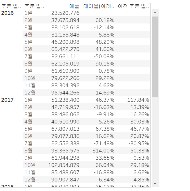 태블로 굿모닝 굿애프터눈(32) - 퀵 테이블 계산 (전월 대비 및 전년 대비 성장률) 본문
