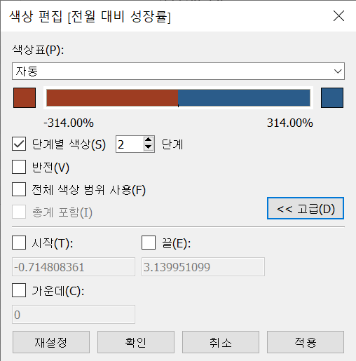 다음과 같이 적용해주면 0을 기준으로 플러스는 푸른색으로 마이너스는 주황색으로 나타납니다 .