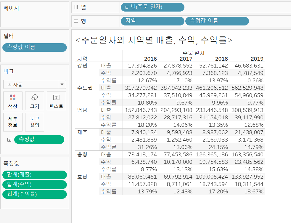 그 후 주문일자와 지역별로 매출, 수익, 수익률을 나타내는 테이블을 구하기위해 주문일자와 지역을 더블클릭 해줍니다.