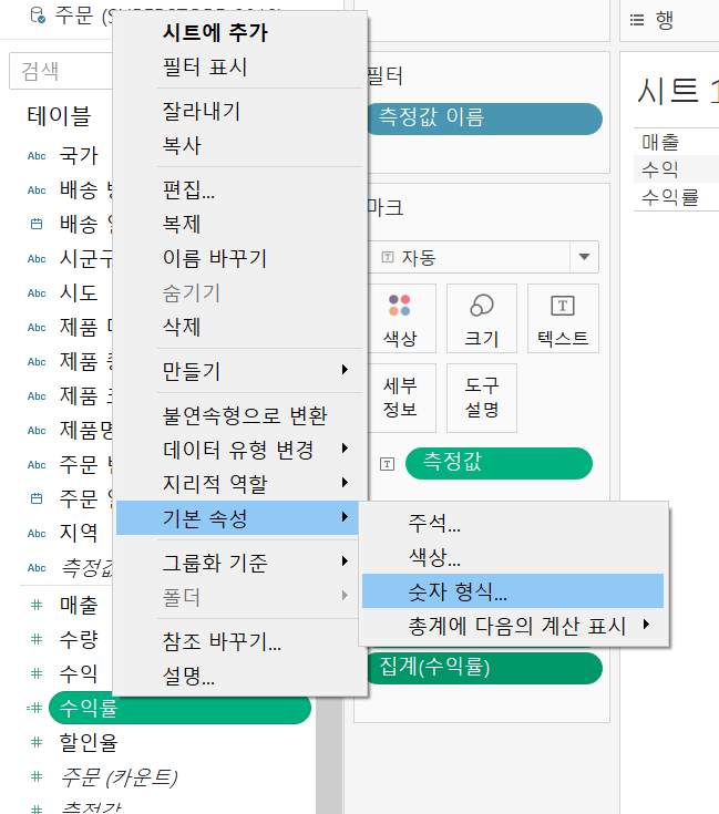 따라서 좌측 사이드바에서 수익률 필드를 우클릭 해주고 기본속성->숫자형식->백분율로 지정합니다.