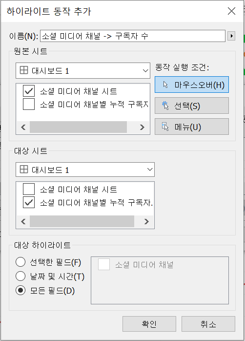 이번에는 상단 시트에 마우스 오버하면 하단 시트에 해당 소셜 미디어 채널명이 하이라이팅 되게 하기 위한 설정을 해보겠습니다. 먼저 대시보드 - 동작 - 동작추가 -하이라이트를 선택합니다.
