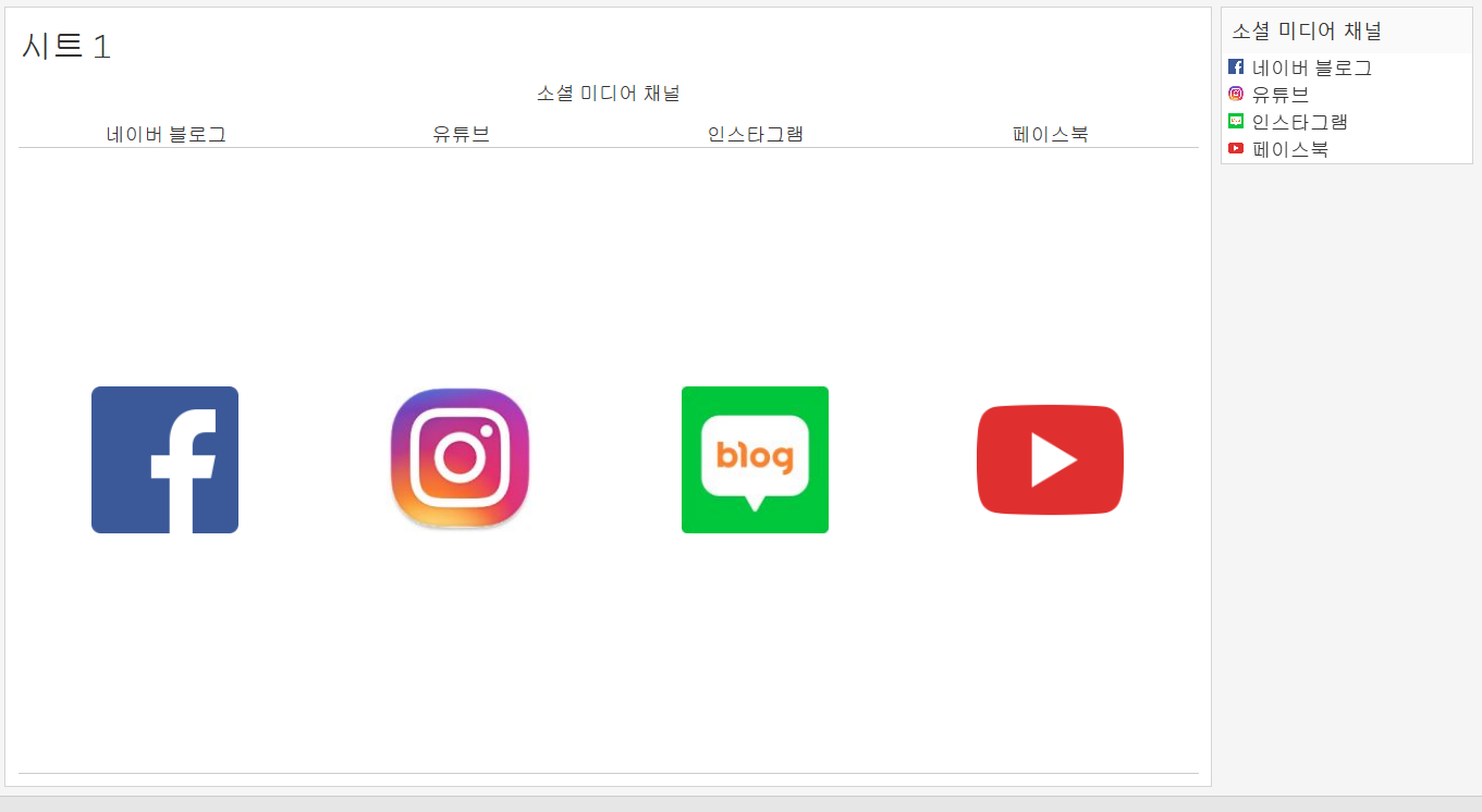 먼저 '소셜 미디어 채널 시트'를 여기에 시트 높기에 올려 줍니다. 그 후 하단에 '소셜 미디어 채널별 누적 구독자 수' 시트를 드래그해서 위치시킵니다. (각 시트에 제목은 숨기고 '소셜 미디어 채널'시트는 영역을 줄여줍니다.)