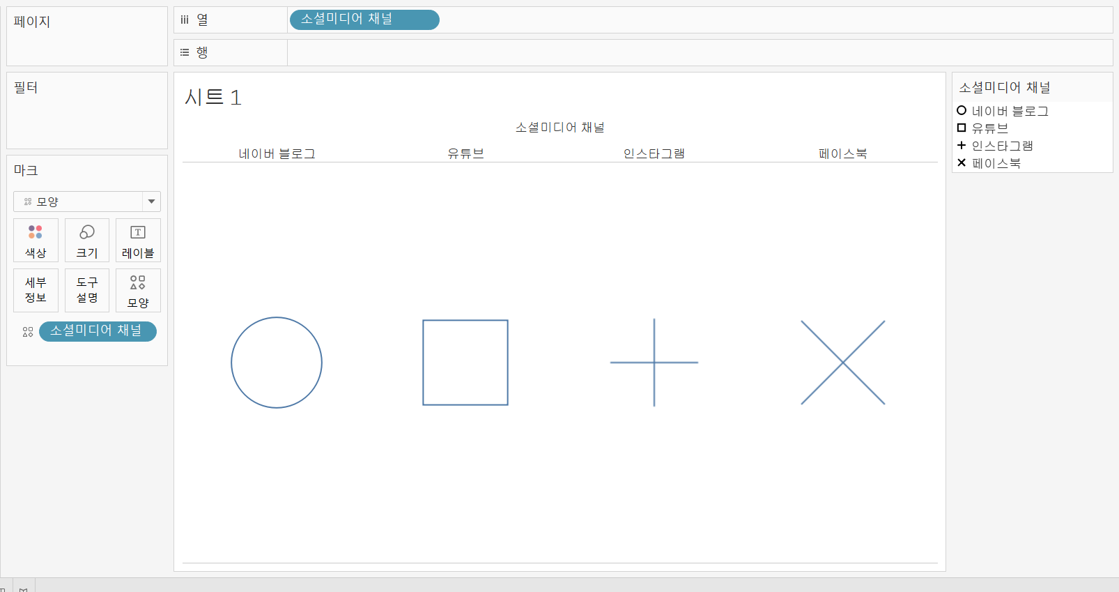 먼저, 마크를 모양 마크로 변경하고 차원에 있는 '소셜 미디어 채널'이라는 필드를 드래그해서 '모양' 마크에 올립니다.