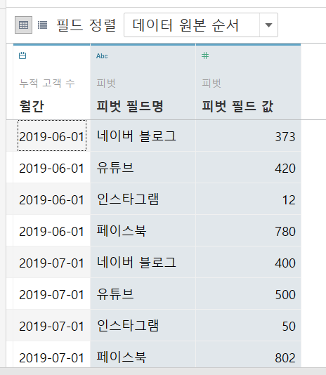네이버 블로그 부터 유튜브 열까지 행으로 변환해보겠습니다.