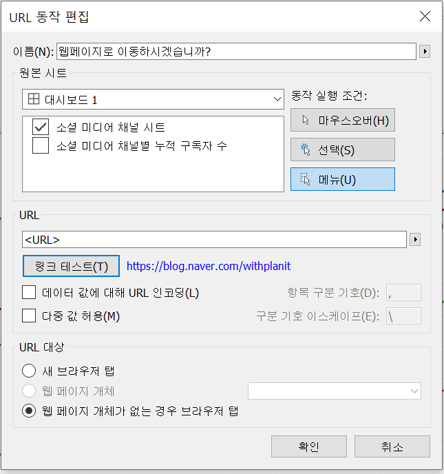URL부분은 > 세모부분을 눌러 URL을 선택하고 확인을 눌러줍니다.